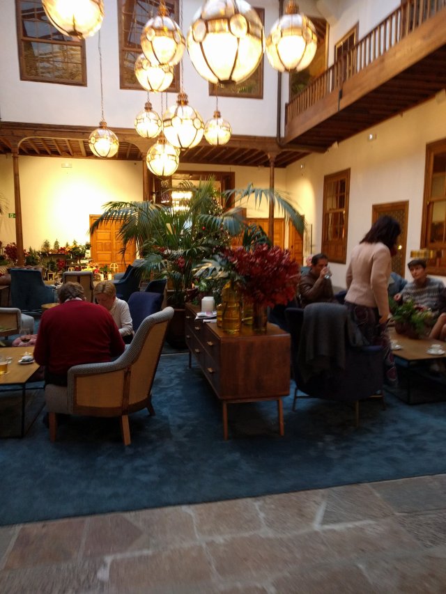 It rained and it rained. It’s six o’clock and it’s rained all day π. Mampa was quite pleased since her legs weren’t working properly today. She walked like a puppet on a string, arms and legs going in all sorts of directions. The last two days of walking up and down steep mountainsides had made her realise that she had muscles that she hadn’t used in a long time and that these muscles were telling her that they didn’t like being used any more. Hopefully with a day off, her muscles will stop complaining and do their job properly when we start walking again tomorrow. In the meantime we’ve been stuck here in the hotel so I’ve taken some pictures of the hotel for you. This first one is the courtyard inside the hotel.