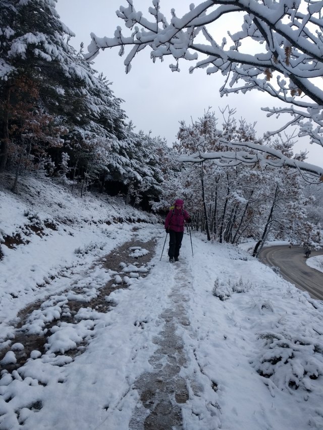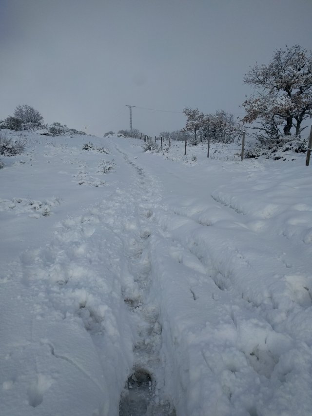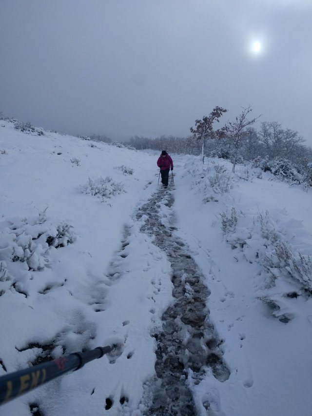 Shortly afterwards as the snow and hail beat down on us, we were forced to give up on the pilgrim’s track alongside the road and walk in the centre of the road itself. There was no traffic apart from the Koreans’ van hired from Hertz to transport their luggage from albergue to albergue and to provide emergency assistance if required, the local police who travelled slowly looking for peregrinos in distress and a solitary snow plough.