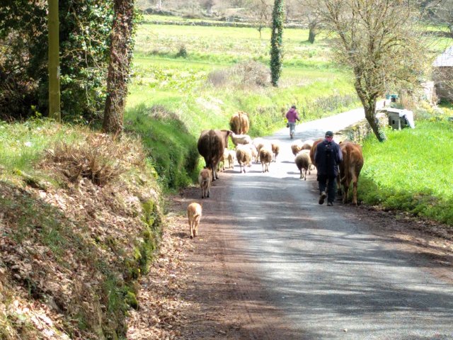 Shortly after we were forced to step to one side by a farmer and presumably his wife driving some cows and sheep along the road.
