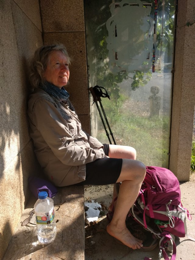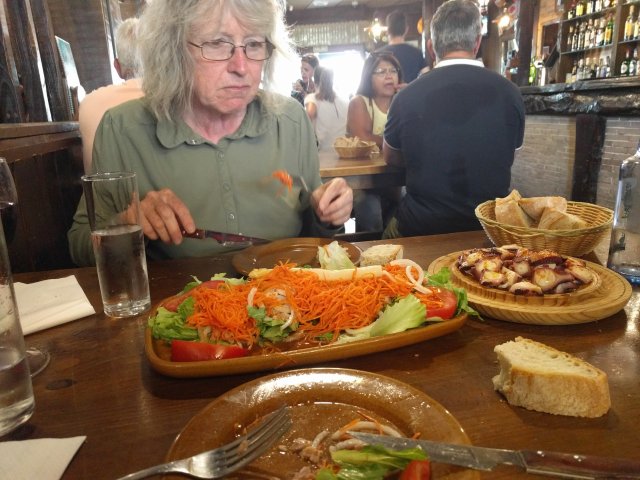 This is mum looking a little concerned at the amount of food. It’s only a little octopus and a large salad but it’s more than sufficient for what are now relatively small stomachs. Neither of us said much during the meal but both of us were thinking about octopuses, at least as intelligent as dogs by all accounts and despite the hassle it’s no more meat or fish for either of us ever again on this or any other Camino. It’s easy being vegetarian/vegan at home but the Spanish are extremely carnivorous by nature and it’s difficult to avoid the stuff. It’s avocados, tomatoes and bread and fruit only from now on.