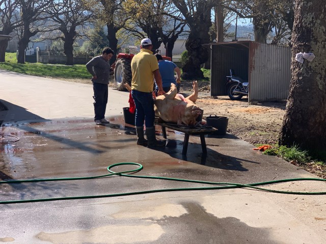two guys gutting a pig on the street. I’ve no idea whether the poor creature had been killed there earlier but copious amounts of blood were still washing down the side of the road when we arrived.