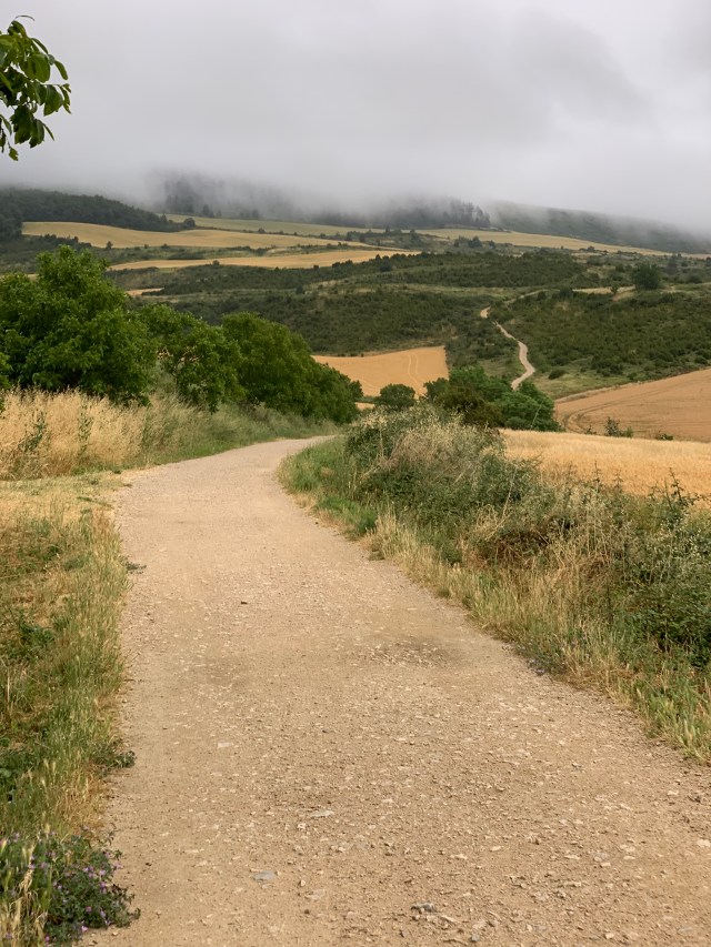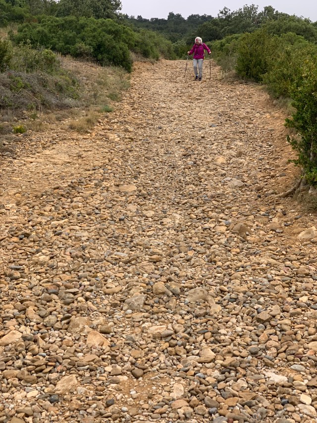 The route off Alto de Perdón appears to follow an old river bed winding its way down into the valley. It’s quite steep, initially full of small loose scree but on its lower half choc full of large pebbles and in today’s weather, quite slippery underfoot.
