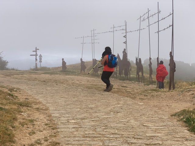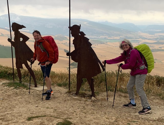 As we sat making our way through our first ham sandwich, thunder rolled across the hills and the first drops of rain fell. Nothing daunts Dorothy so after finishing our coffees we headed out, put on our anoraks and the coverings over our rucksacks and suitably clad we made our way up to Alto de Perdón.