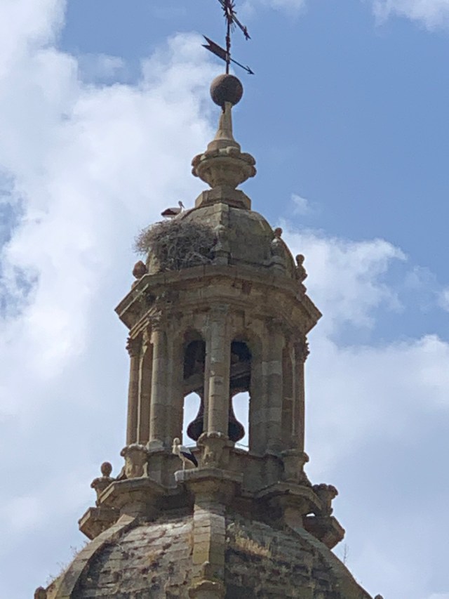 Our albergue is very pleasant. We stayed here last time we walked this way and indeed we have the same room looking out on the local church in which at 10x resolution on my XS it’s possible to see our first storks this year 😊.