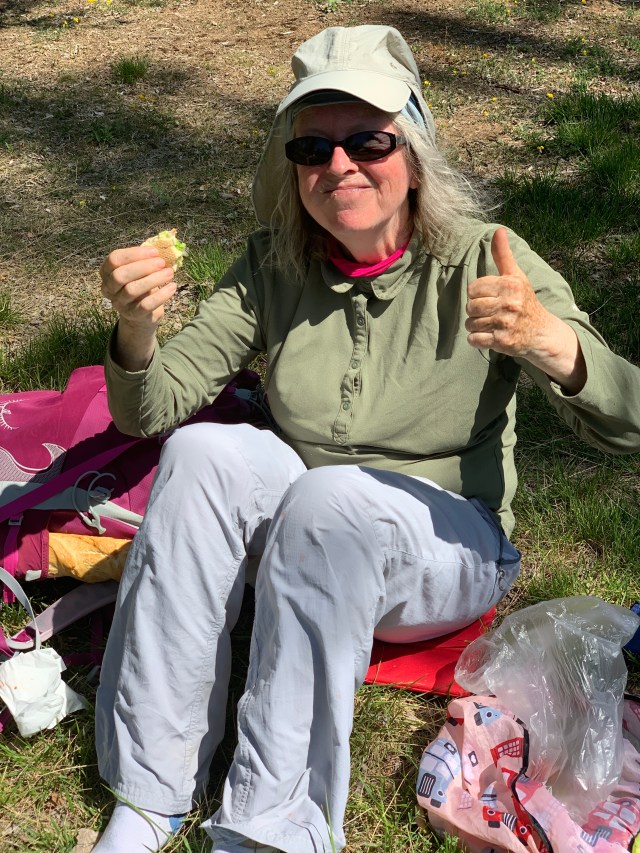 We stopped for lunch of bread, avocado and cherry tomatoes. Here’s Dorothy bundled up to protect herself from the blinding sun. This is the first occasion we’ve had to use our nice bottom pads.