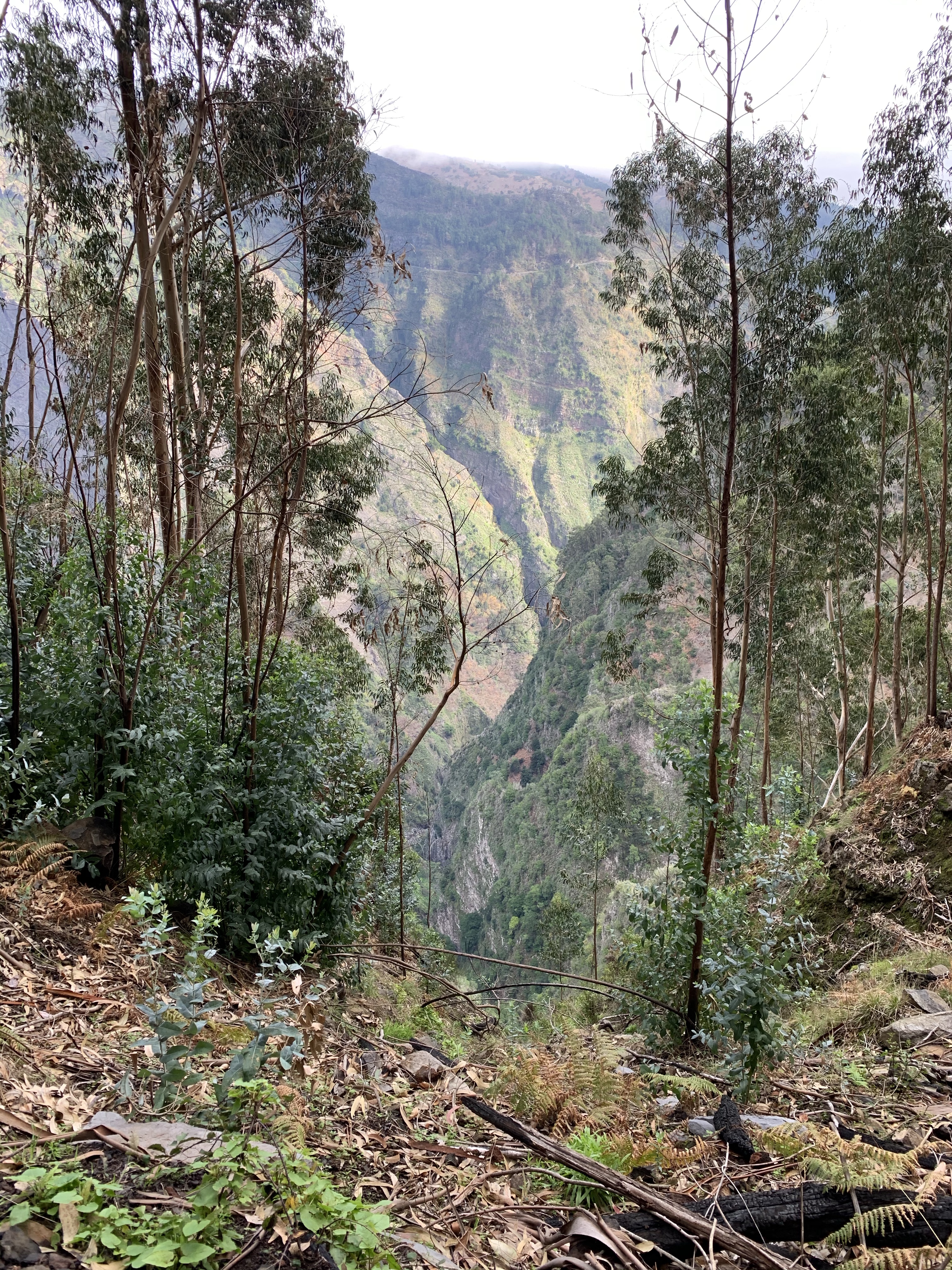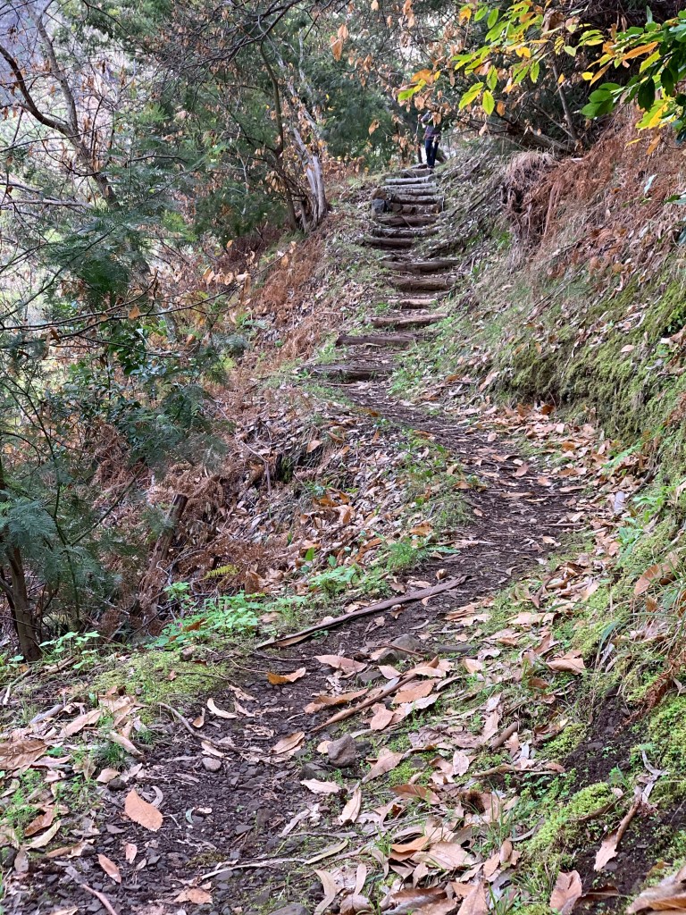 Suitably impressed, we stopped at a small bar in the village for coffee and a sweet croissant before following route 42 of Shirley and Mike Whitehead’s excellent second volume of Madeira walks. I’ve downloaded, with a bit of software jiggery pokery, the GPX waypoints into maps.me so it’s now pretty impossible to get lost. Filled with coffee and croissant we headed off along the road. The actual route didn’t start for 1.5km but there’s a description of how to get there so we followed it carefully and found ourselves walking up a one in three gradient past a stables and on into the forest composed mostly of eucalyptus trees.