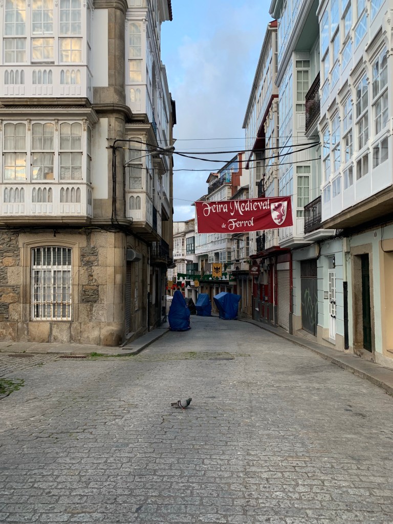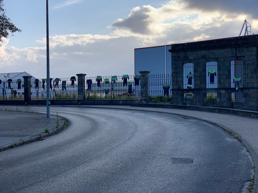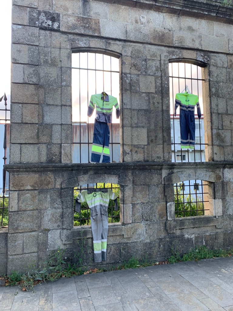 The journey out of Ferrol took us past what appears to be a still thriving port. Apparently, the Navantia group is still a major shipbuilding company operating in Ferrol though I have no idea why worker’s overalls are impaled on the railings outside the main entrance.