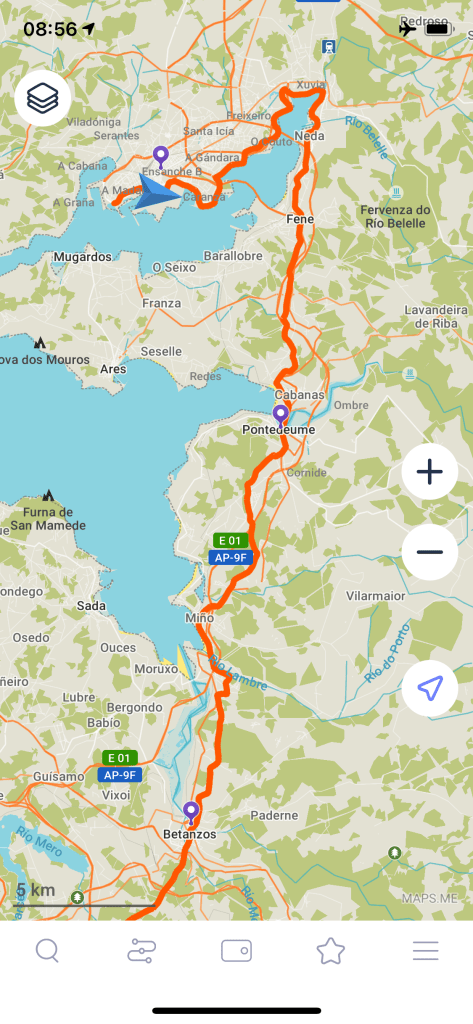 The map below shows just how far we have to go. We started at the purple marker at top left, walked west to the start of the meandering orange line indicating the route of the Camino ingles and all being well, we’ll finish at the middle purple marker some 30km later. The bottom purple marker shows is where we’re starting tomorrow night.