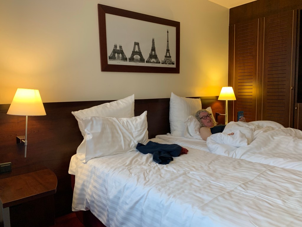 … and some one and a half km from the hotel we finally gave up, hopped out of the taxi and walked the rest of the way. The hotel is right next to Gare Montparnasse where we’re picking up the TGV to Bayonne tomorrow morning. We’ve had dinner (a salad entree), a glass of decent red wine and some fries so we’re replete. We’ll grab some breakfast around 8 o’clock and head off. In the meantime, Dorothy is already in bed and I’ll join her shortly (in my own single bed 😢).