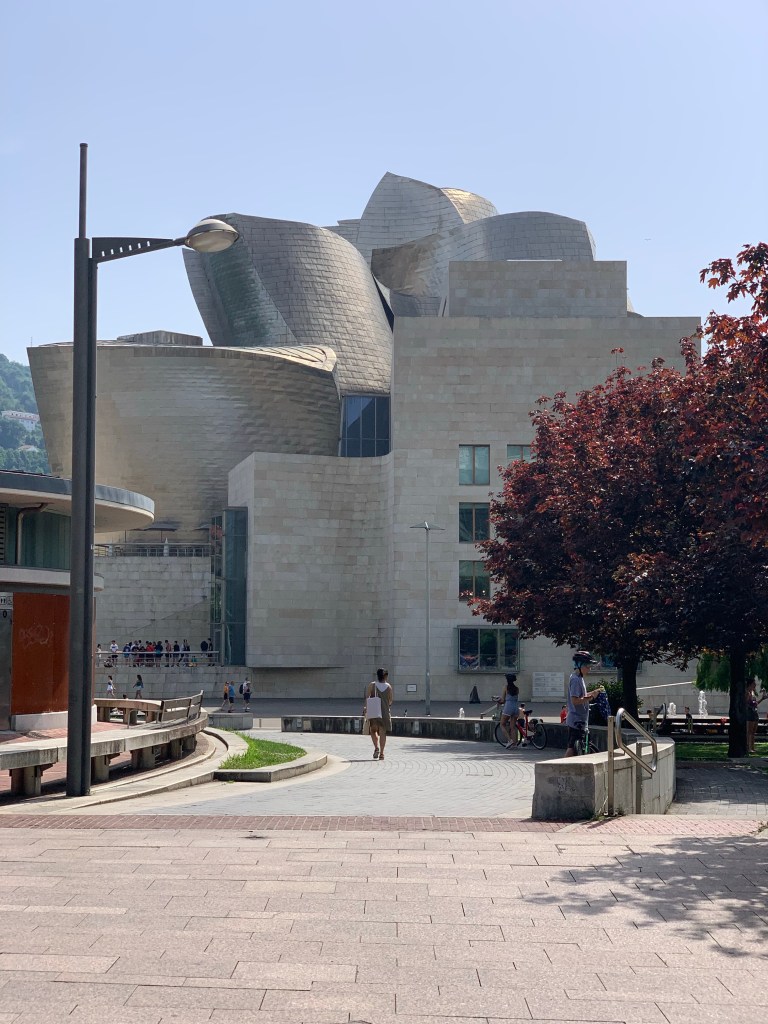 After some breakfast in a bar close to the bus station we’ve parted company 😢. They’ve caught the bus to the airport and home while we’ve strolled along the riverside path towards the Guggenheim.