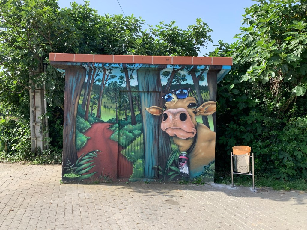 We walked for quite a few km alongside a fast cycling route, clearly designed for those Lycra clad conquistadors who tore past us in a shimmering haze of colour. Leaving the cyclists we came through a small village with this delightful mural.