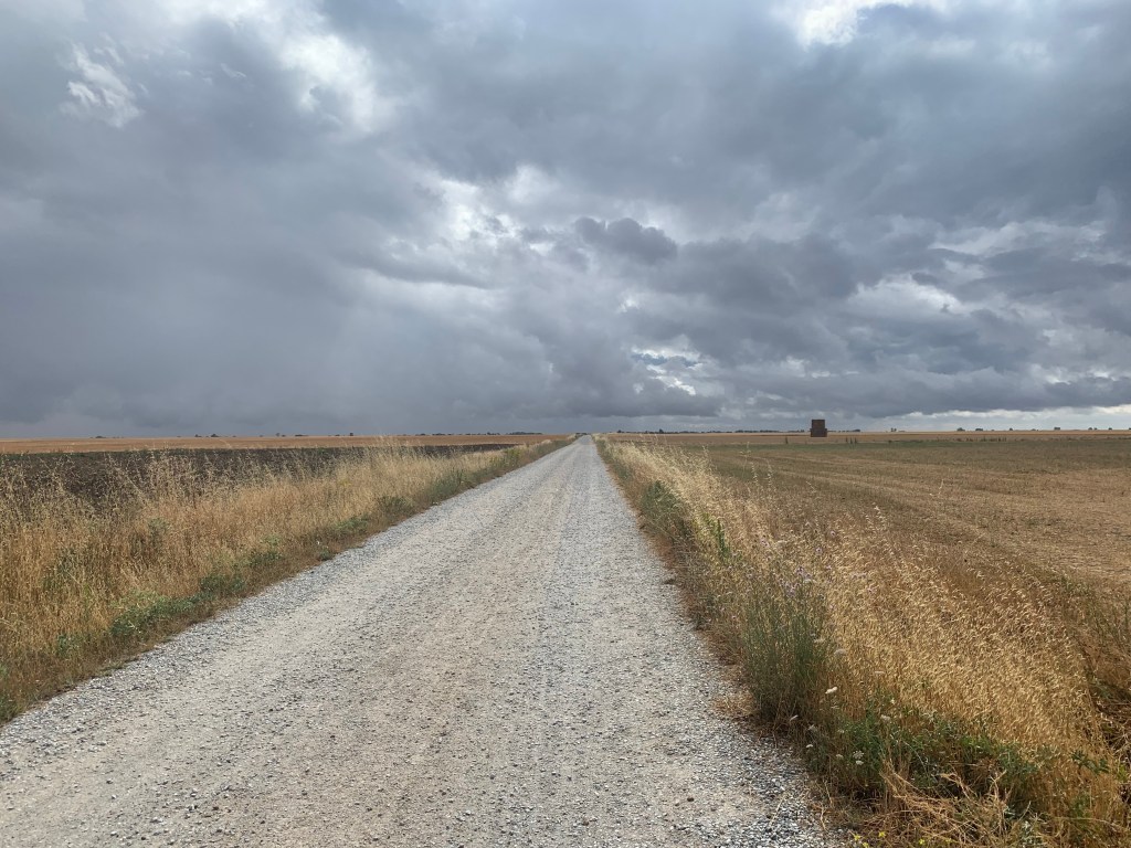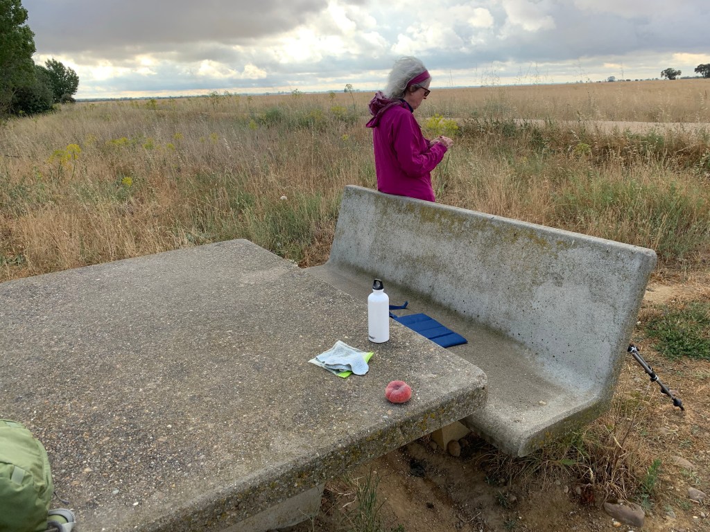 The road ran along the route of an old Roman road for 17+ km. There have been the occasional undulations and long sweeping curves but essentially it’s been a long, long straight road – interminable is a more apt description. The last time we came this way there were long rumbles of thunder and sharp bolts of lightning with savage bursts of rain. Dorothy and I took what shelter we could from a concrete table and bench and huddled together for warmth. Today was a little better and we managed to have a reasonably decent picnic before continuing.