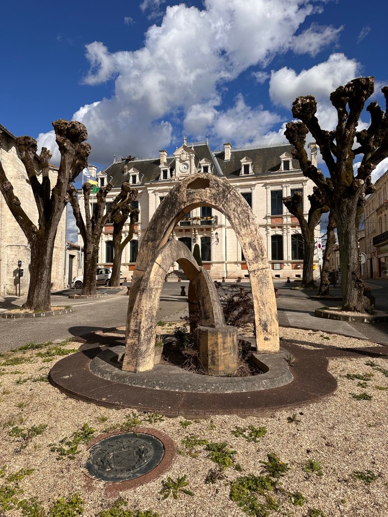 Our final stop before reaching Ibis budget Angoulême Nord was at Mansle, a village étape where we stopped for a cup of chamomile tea (which they didn’t have so we had some random herbal tea instead). Like many of the étapes, it was pretty run down but the centre held an odd sculpture surrounded by trees pollarded to within an inch of their lives.