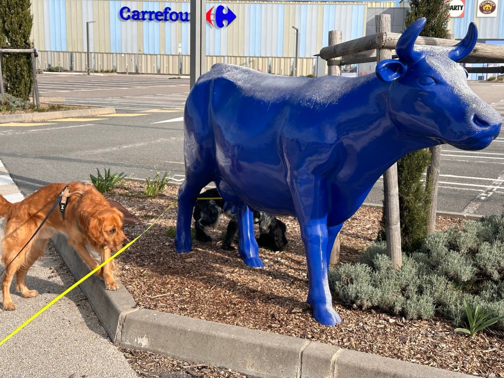 We’ve charged in the relatively nearby Carrefour where you can see Tal and Perro checking out a rather blue cow.