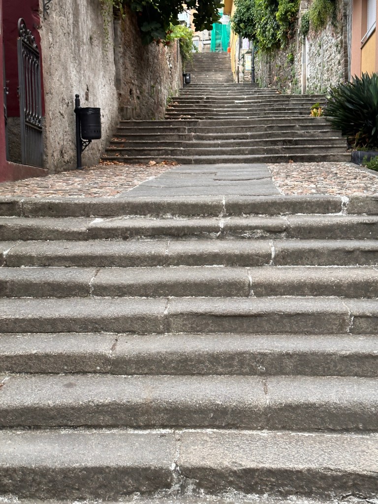 We ate at the restaurant recommended by the receptionist. It had excellent food, perhaps the best we’ve eaten and great views over the lake. We shuffled there and back without incident though both of us are struggling with painful calves and blistered little toes. Once walking we tend to ‘oil up’ and legs and feet begin responding appropriately to messages from the brain. Unfortunately, until that point we must look like a pair of out of control marionettes. Such are the joys of long distance walking 😞.