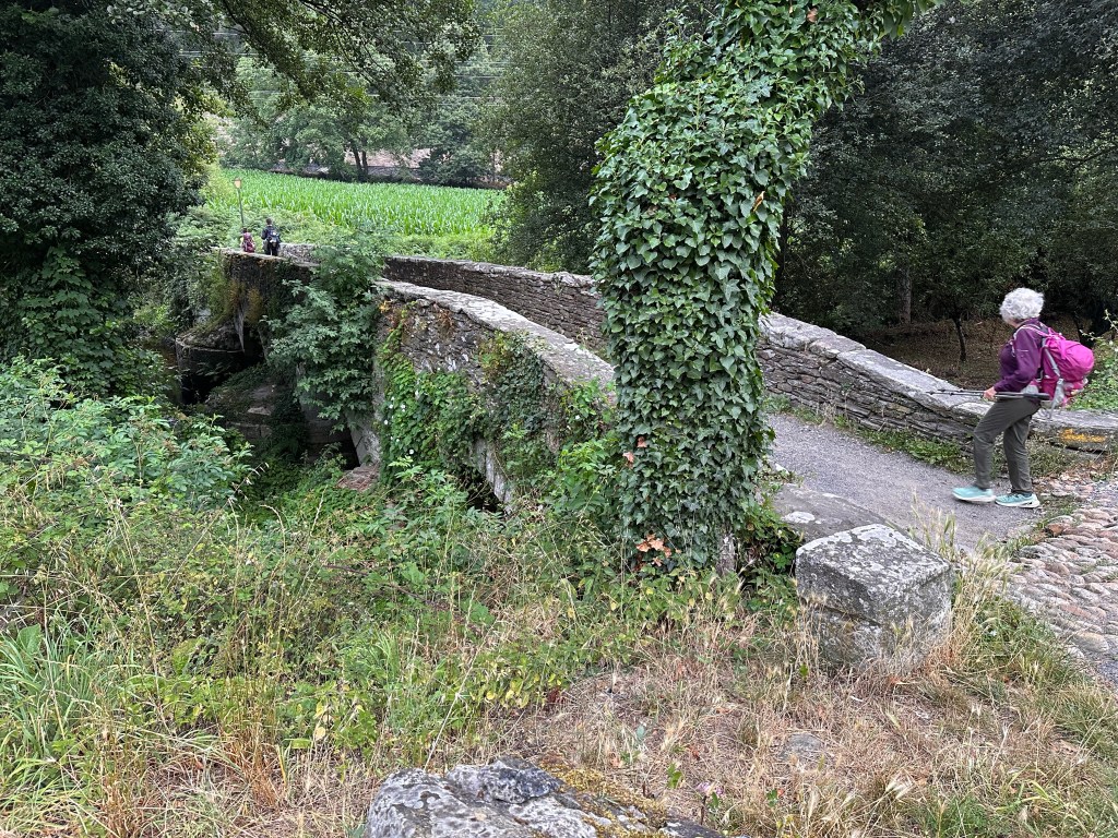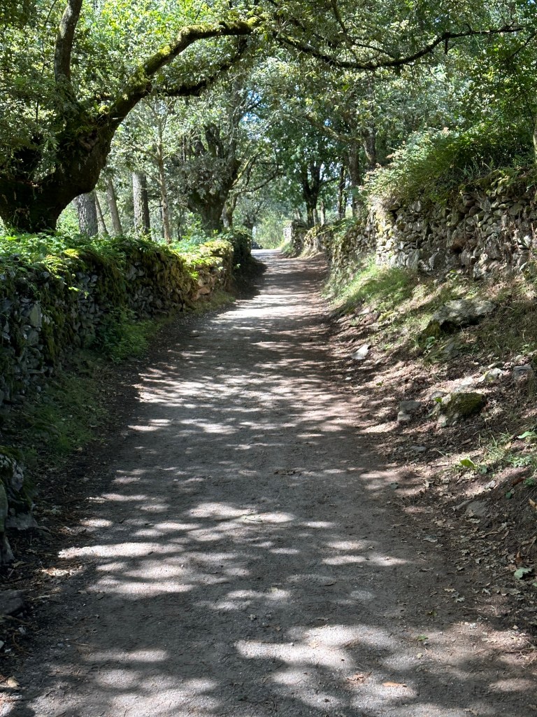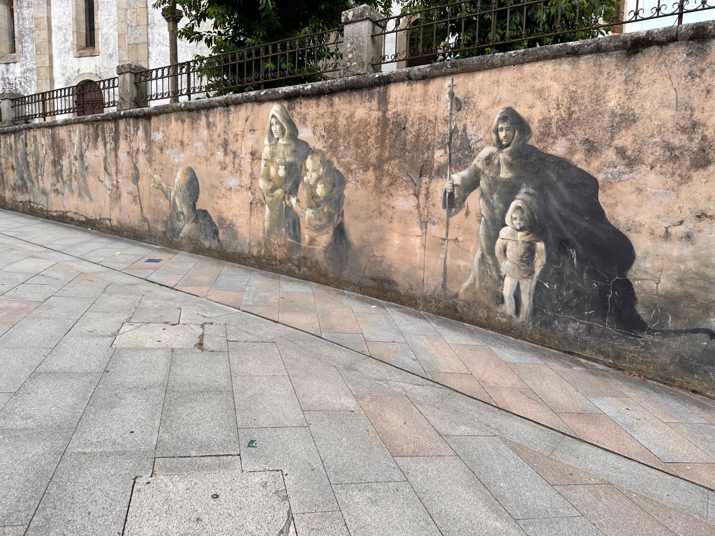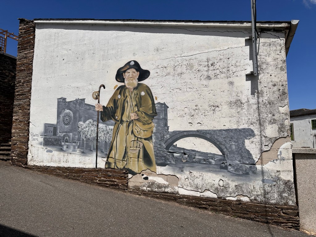 Oddly, early on the walk we passed a Brazilian priest, identical in appearance to this chap if the hat is replaced with a long white ponytail. Clad in simple sandals, he shuffled slowly, dragging his right foot, seemingly in some pain. We passed him, wished him Buen Camino and exchanged a few cheerful words in English before walking on a few kilometres to a small café. Shortly after finishing our coffee he passed us, walking in the same fashion. We overtook him for the second time. I was about to ask if he needed any help when he smiled and wished us well on our camino. Assuming that Portomarin was his destination today, I’ve no doubt that he made it. It’s a little under 90 kilometres left to Santiago and I’m sure that with patience and a little care he’ll arrive safely at the cathedral. I rather suspect that he’s amongst a very small group of true pilgrims on the Camino.