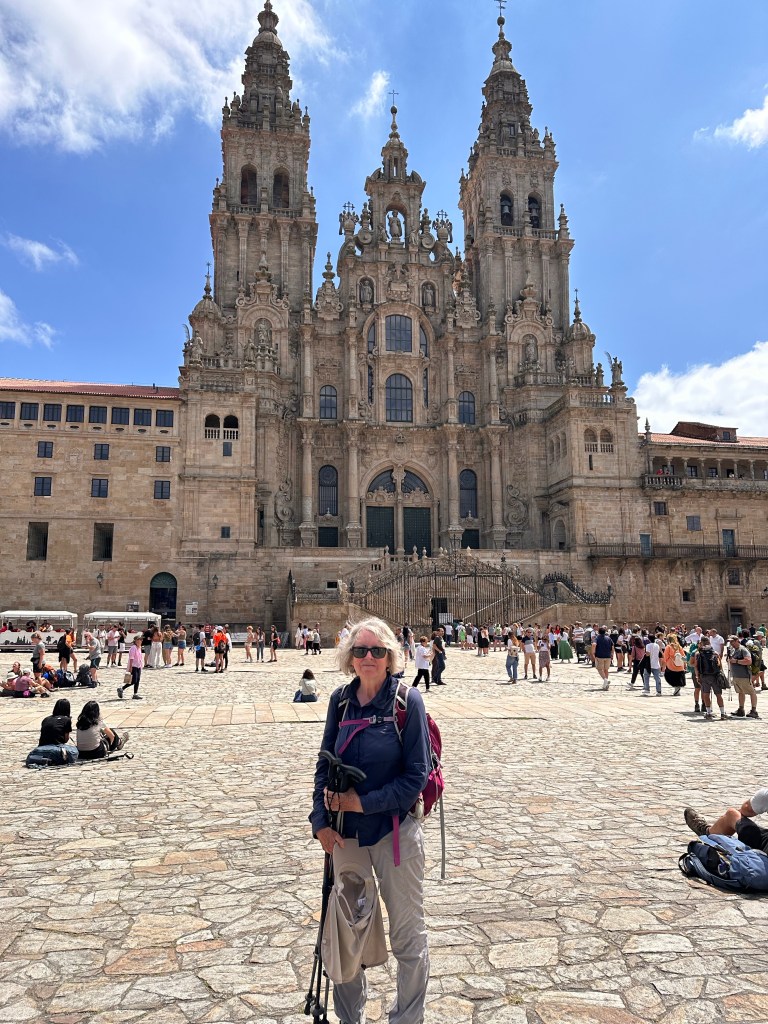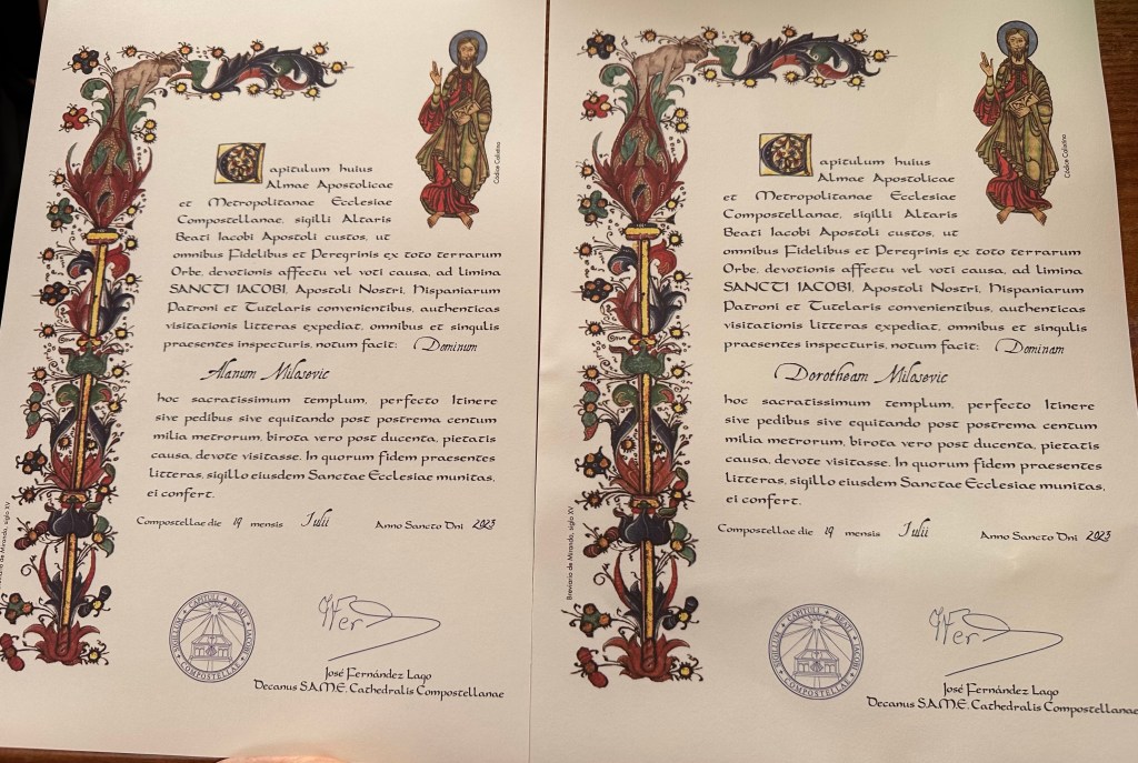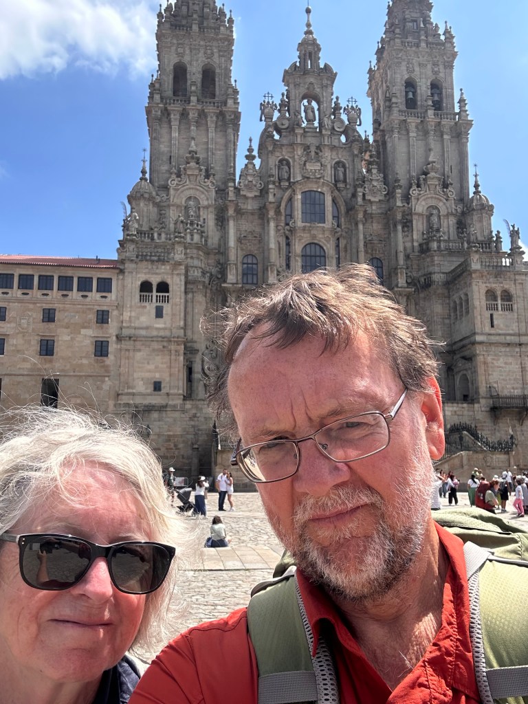 We have arrived, it’s sunny, the last 19 km was a relative doddle, we’ve checked in, showered, had lunch, got our compostelas …