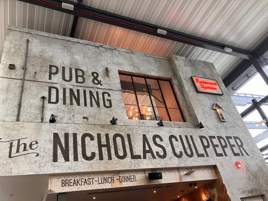Our plane doesn’t leave until 18:15 and it’s now 14:31 so we’re too early to check in so we’re at the Nicholas Culpeper pub.