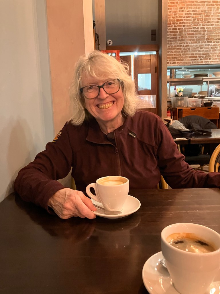 This is Dorothy holding up a wisteria pod that we managed to pull down from an overhead wisteria by my lifting Dorothy high into the air. Jumping up repeatedly and trying to snag one gave passing pedestrians much amusement but not much success for me. Dorothy is hoping to grow wisteria from the contents of the pod 🤞.